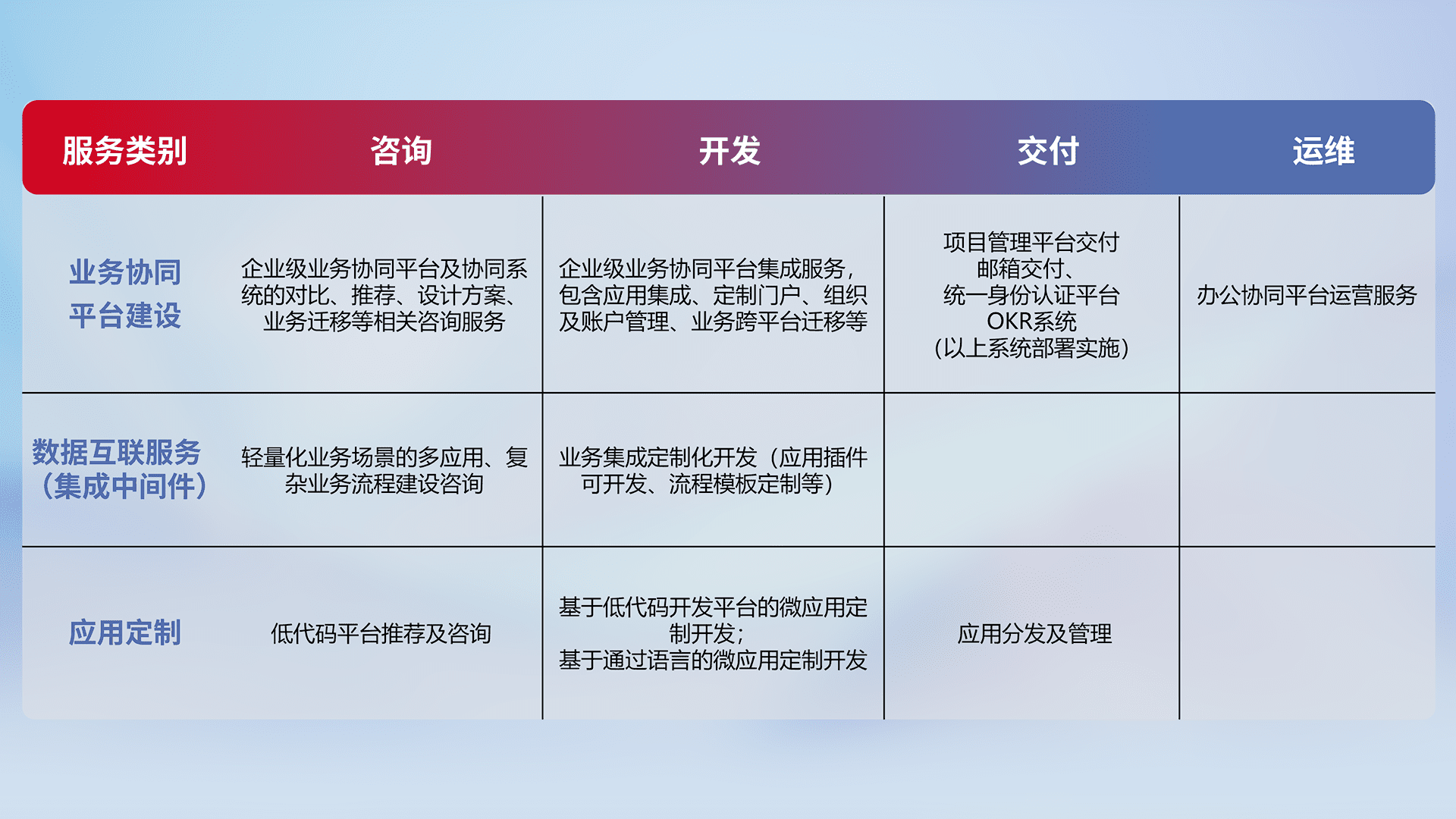 针对钉钉、、企微、、、IDaas等平台级产品提供产品的规划、、、方案、、、交付、、、、定制化开发等服务,,实现如统一协同办公、、、智能客户服务、、混合会议管理、、智能数据查询、、、、等业务场景,,,实现数字化转型。。。。